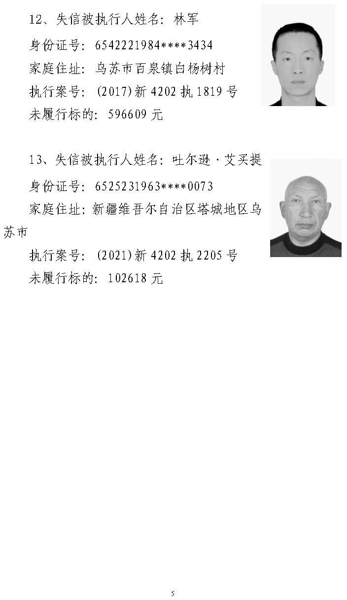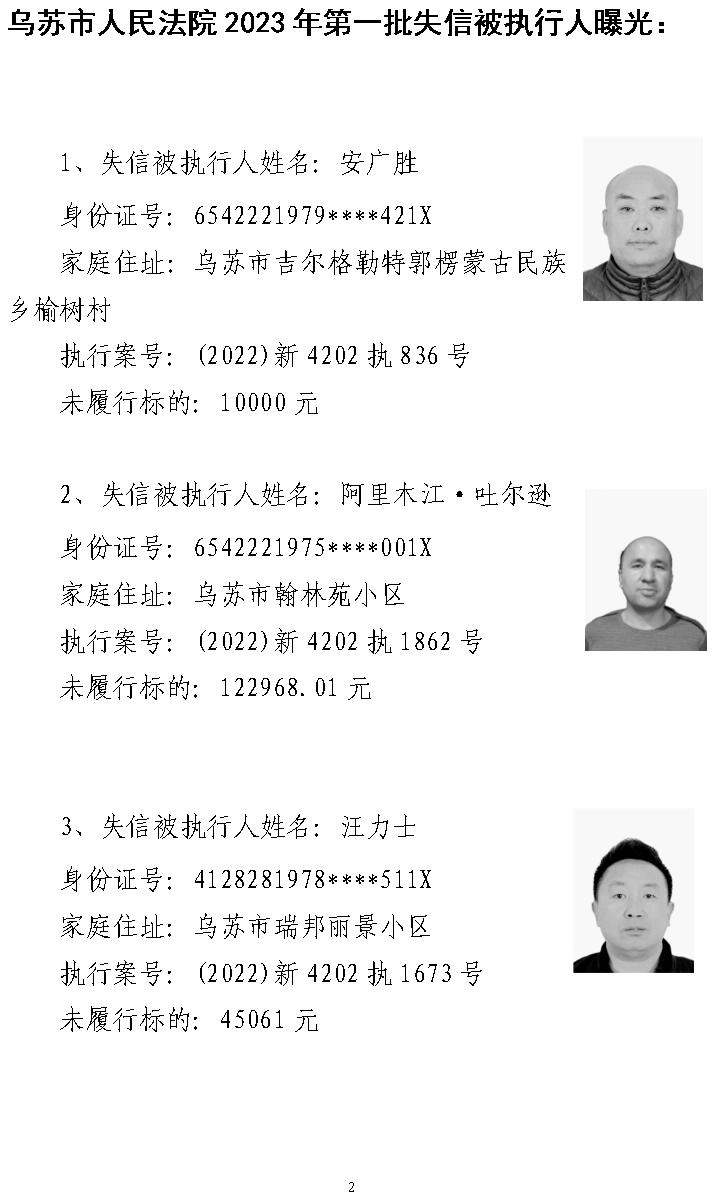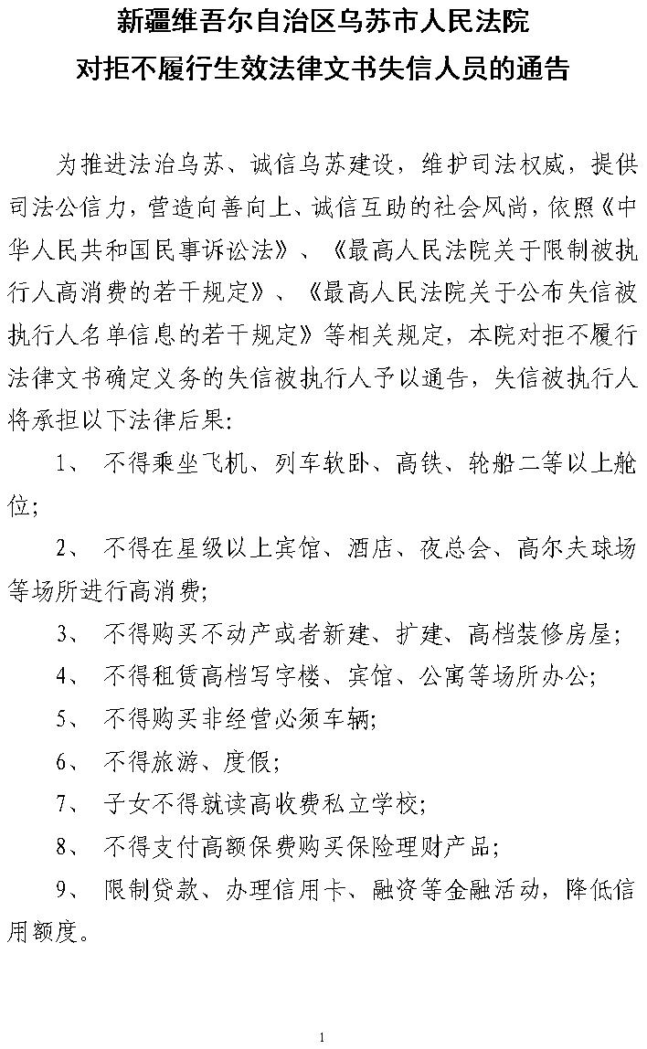 乌苏市人民法院对拒不履行生效法律文书失信人员的通告