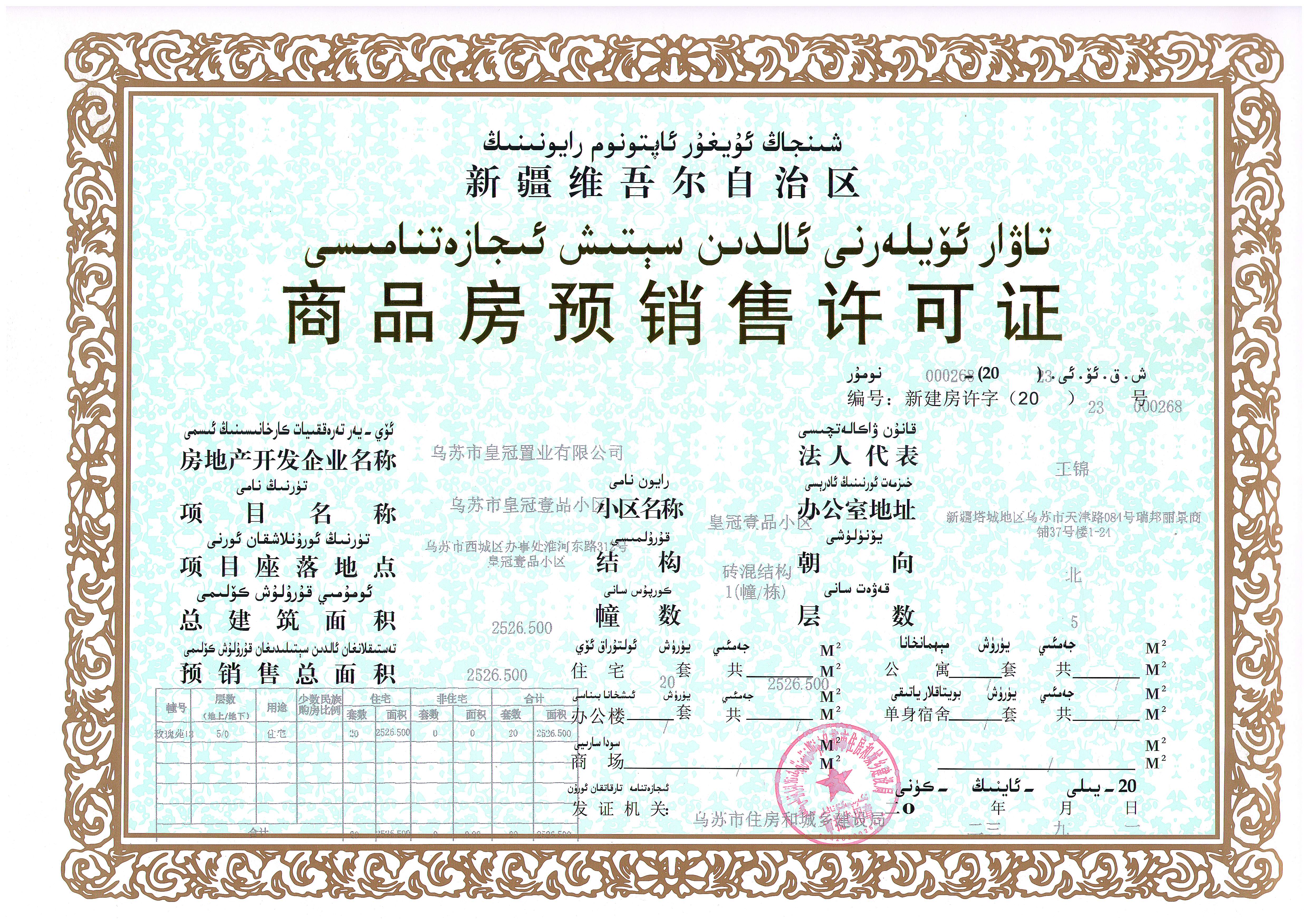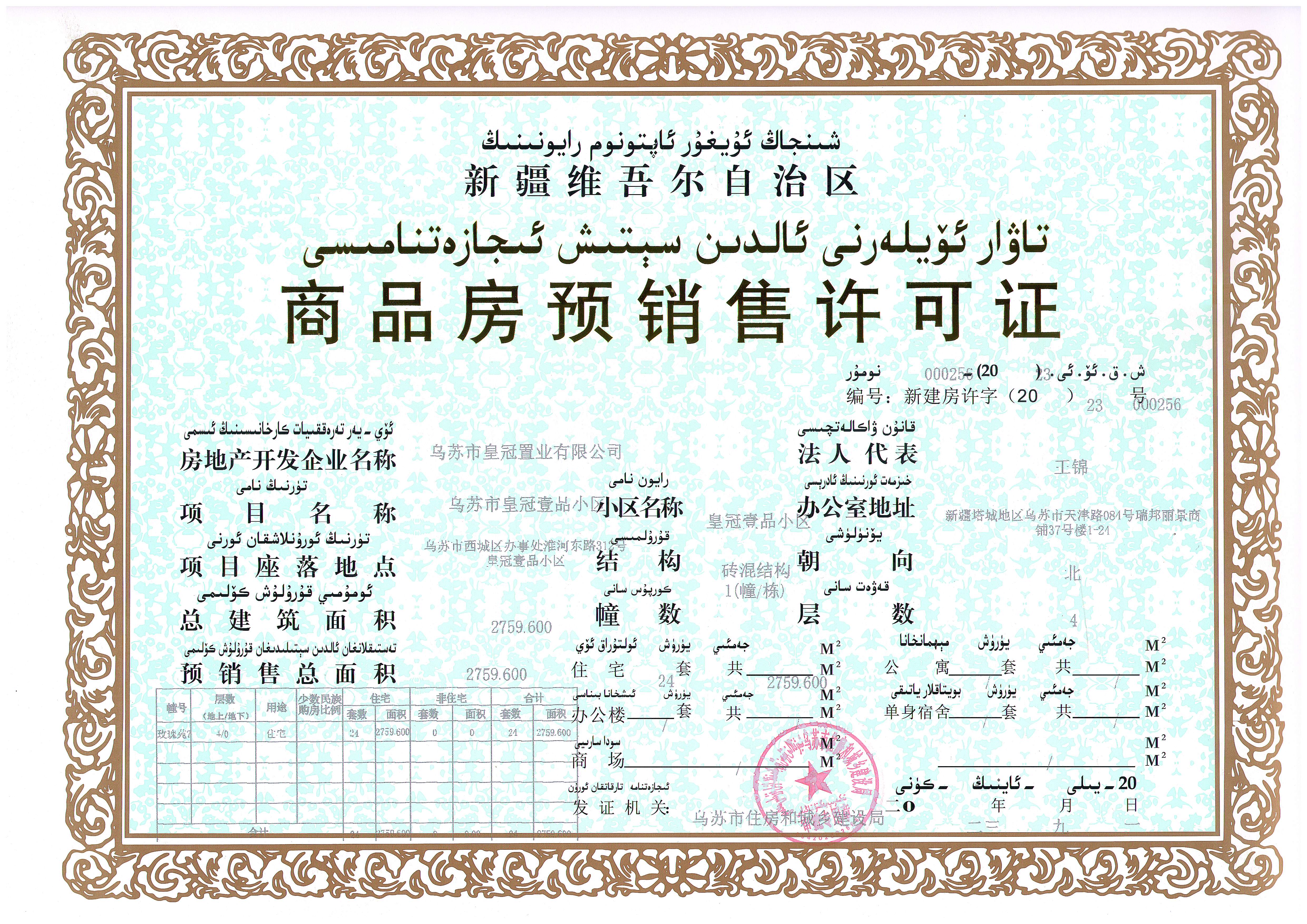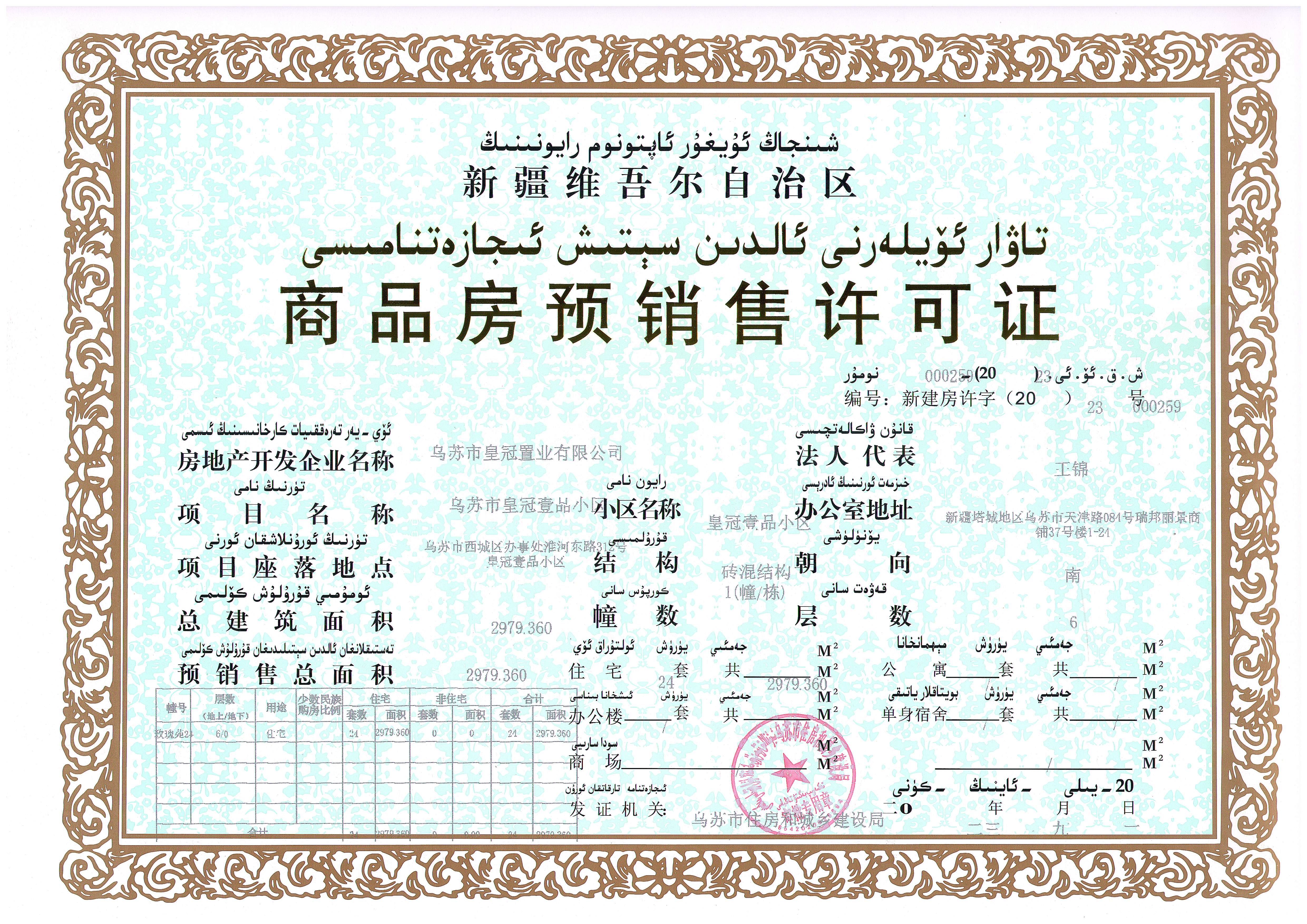 由乌苏市皇冠置业有限公司开发建设的皇冠壹品项目2号、7号、10号、15号、18号、24号、25号多层住宅楼共计7栋160套商品住房,预销售总面积19382.72平方米,位于西城区办事处淮河东路312号。经审查该项目符合预售条件,根据《中华人民共和国城市房地产管理法》《城市房地产开发经营管理条例》《城市商品房预售管理办法》相关规定,依法颁发《商品房预售许可证》,准予预售。编号:新建房许字(2023)000254、新建房许字(2023)000256,新建房许字(2023)000255、新建房许字(2023)000257、新建房许字(2023)000268、新建房许字(2023)000259、新建房许字(2023)000260现予以公示。