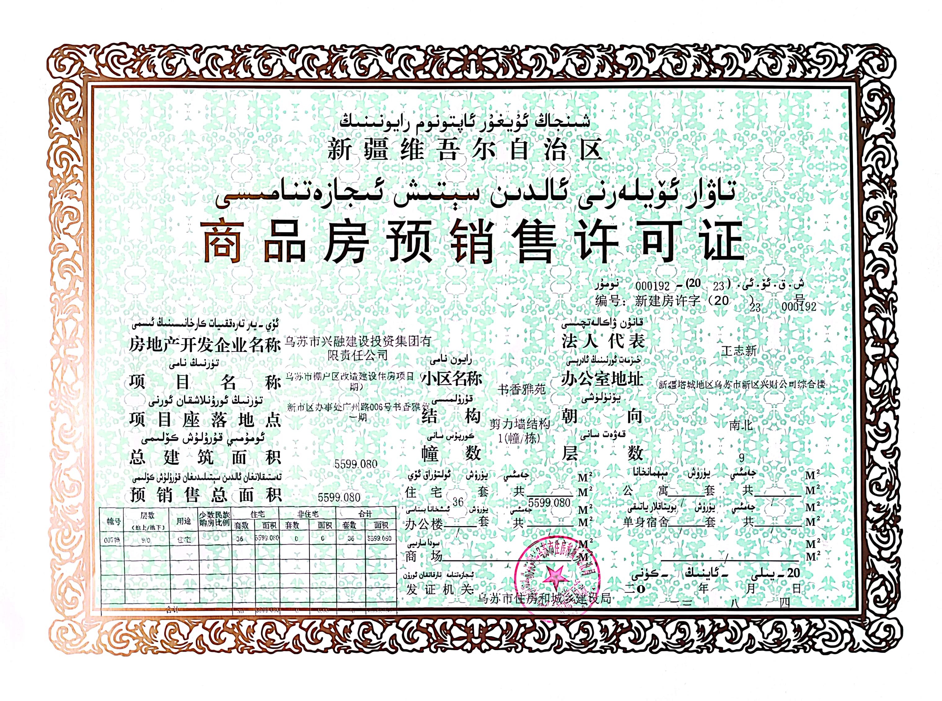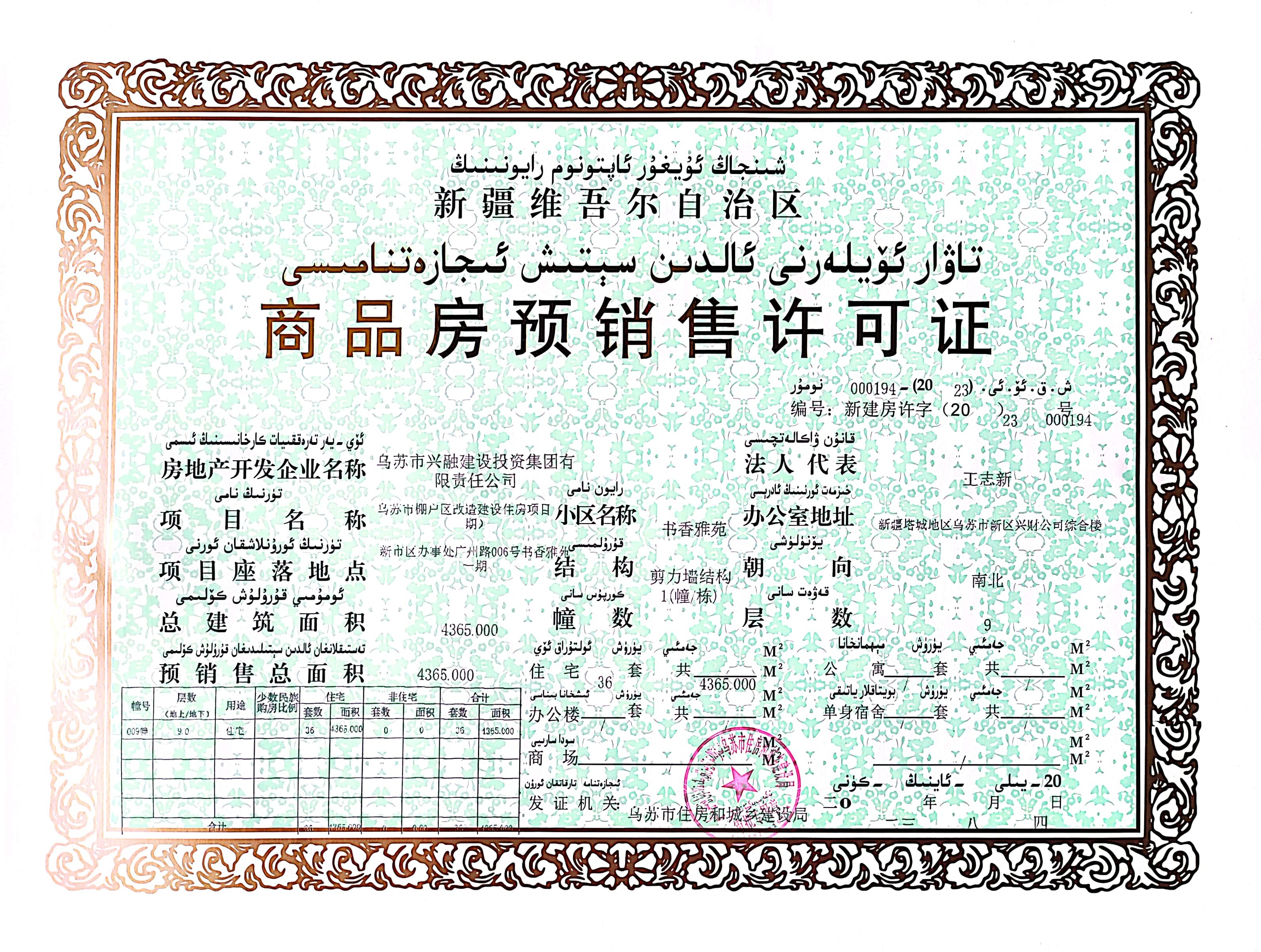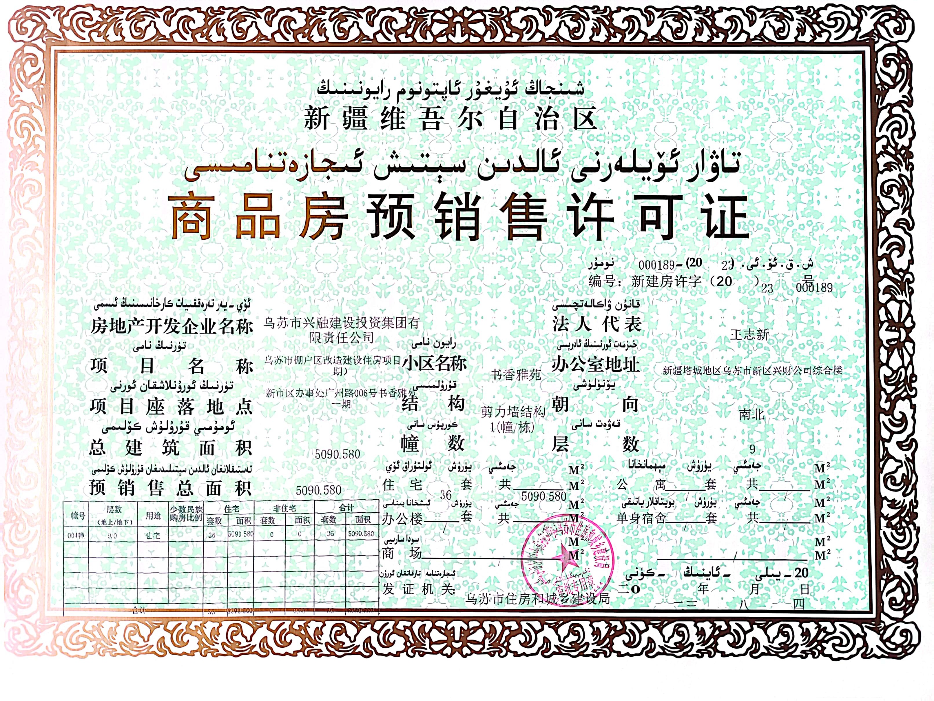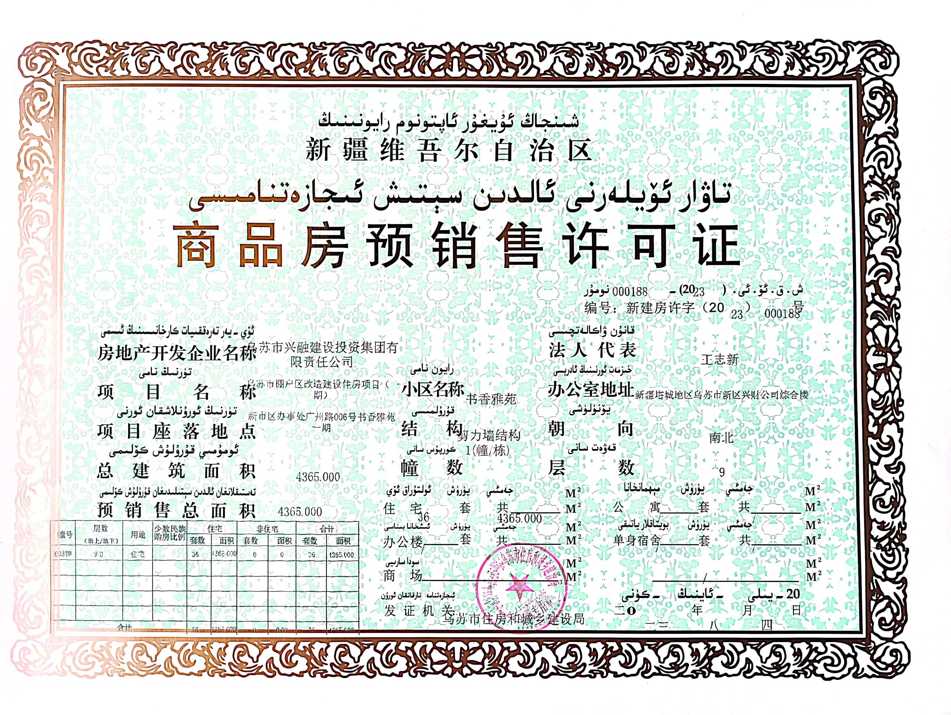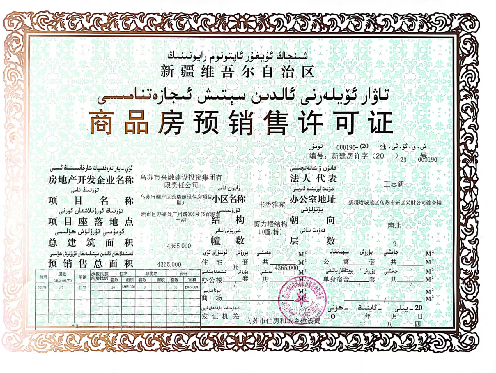 由乌苏市兴融建设投资集团有限责任公司开发建设的书香雅苑一期项目1--9号楼共计9栋370套商品房(其中:住宅350套,非住宅20套),预销售总面积46953.34平方米,位于新市区办事处广州路006号。经审查该项目符合预售条件,根据《中华人民共和国城市房地产管理法》《城市房地产开发经营管理条例》《城市商品房预售管理办法》相关规定,依法颁发《商品房预售许可证》,准予预售。编号:新建房许字(2023)000195、新建房许字(2023)000196,新建房许字(2023)000188、新建房许字(2023)000189、新建房许字(2023)000190、新建房许字(2023)000191、新建房许字(2023)000192、新建房许字(2023)000193、新建房许字(2023)000194现予以公示。