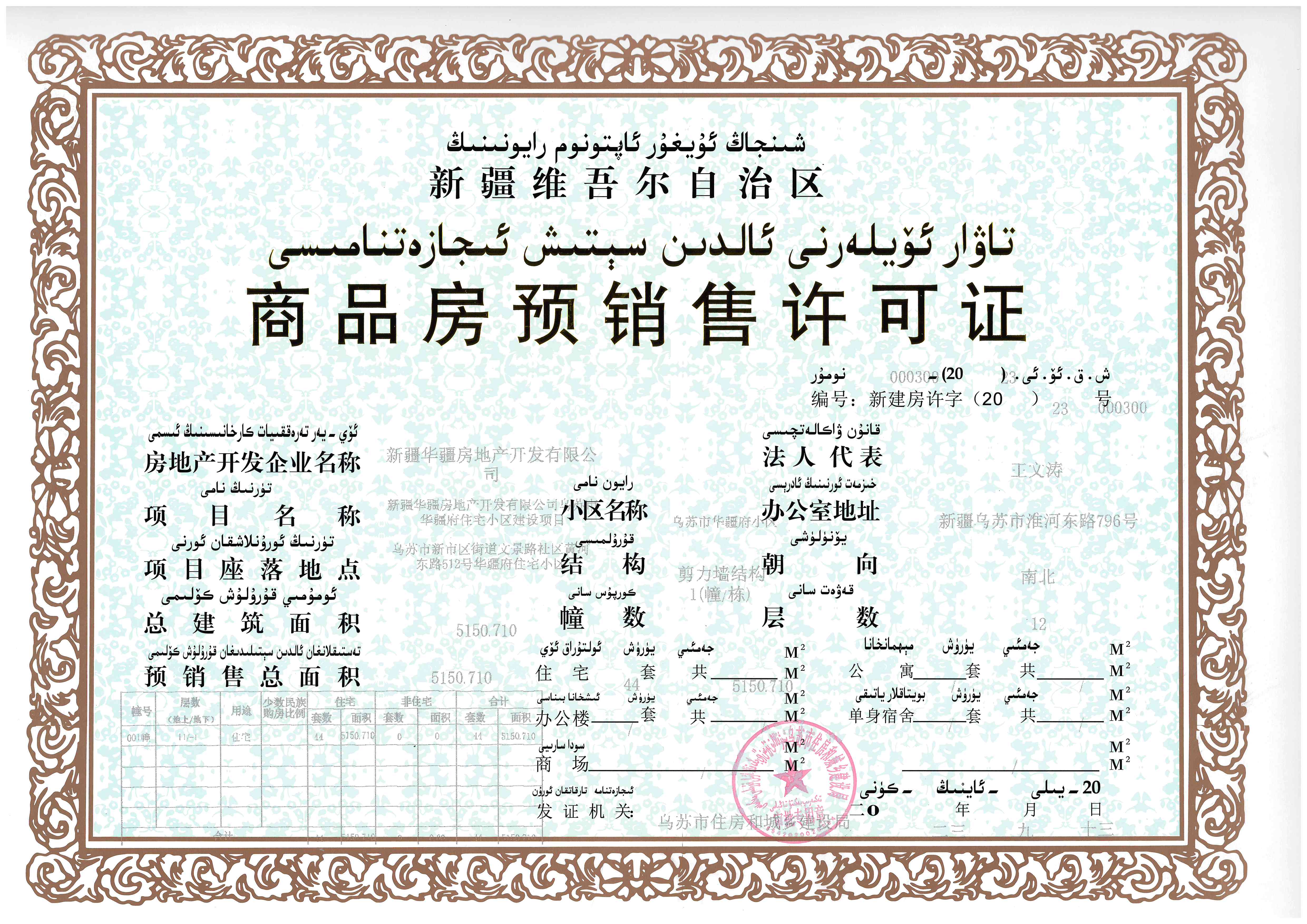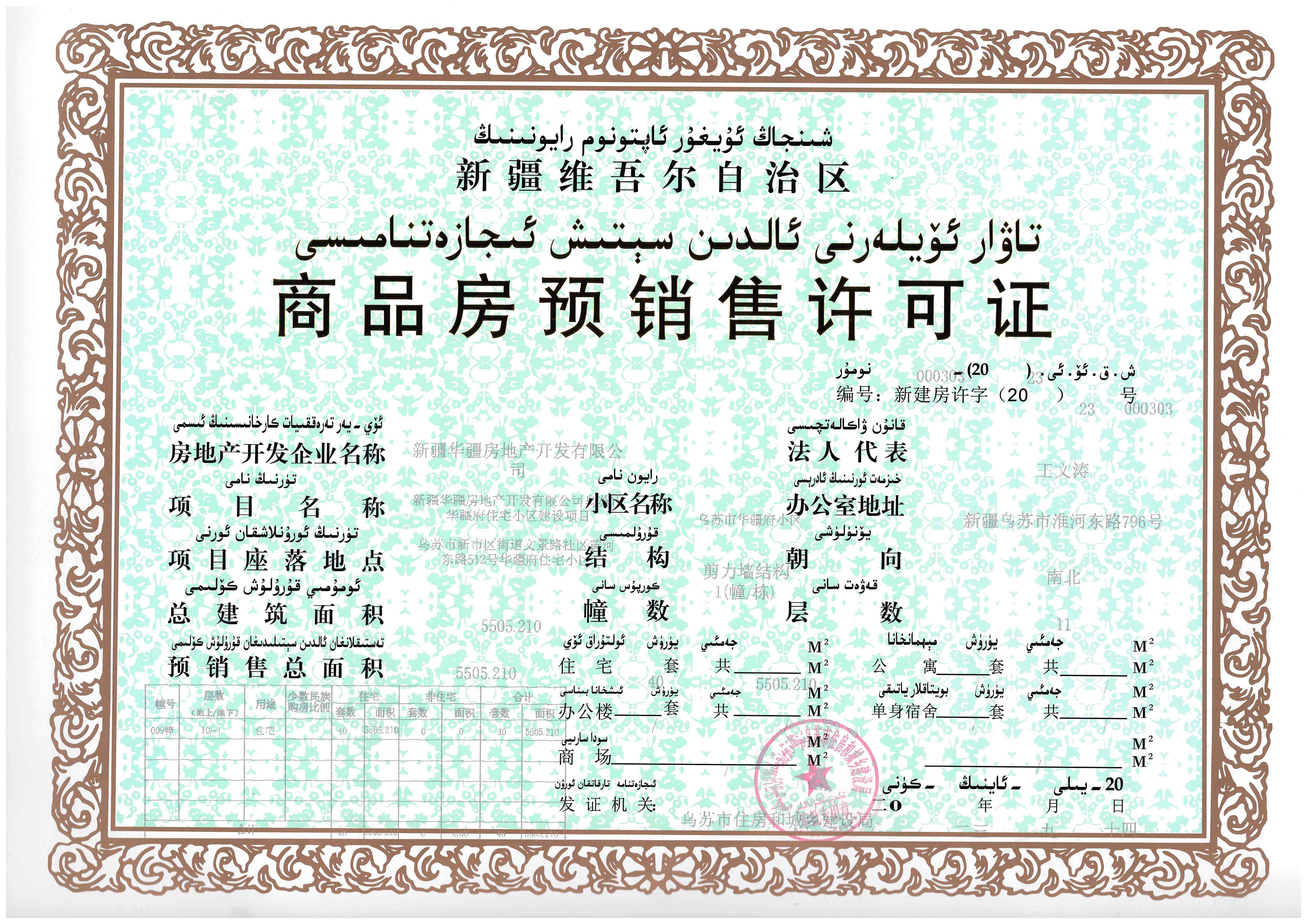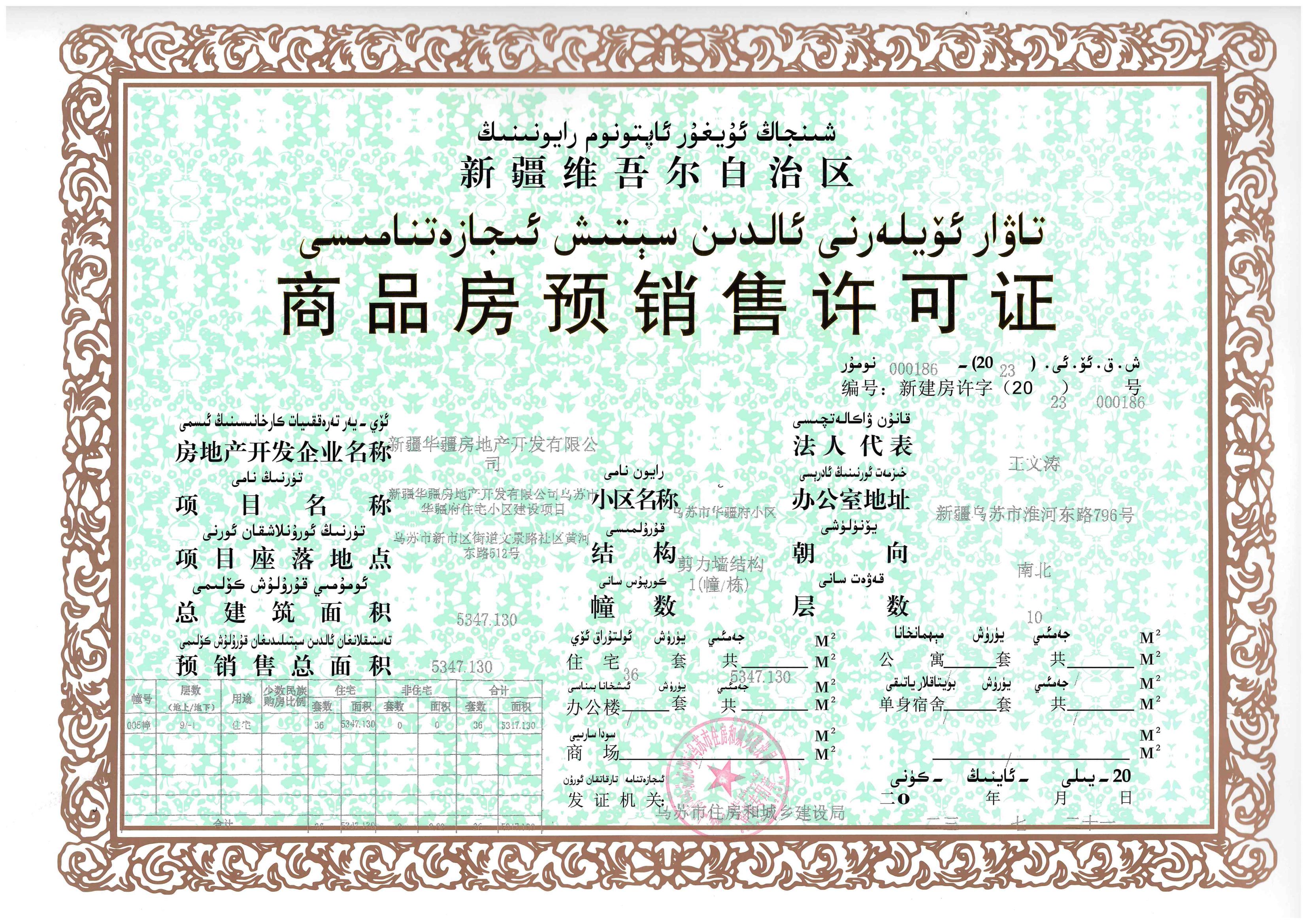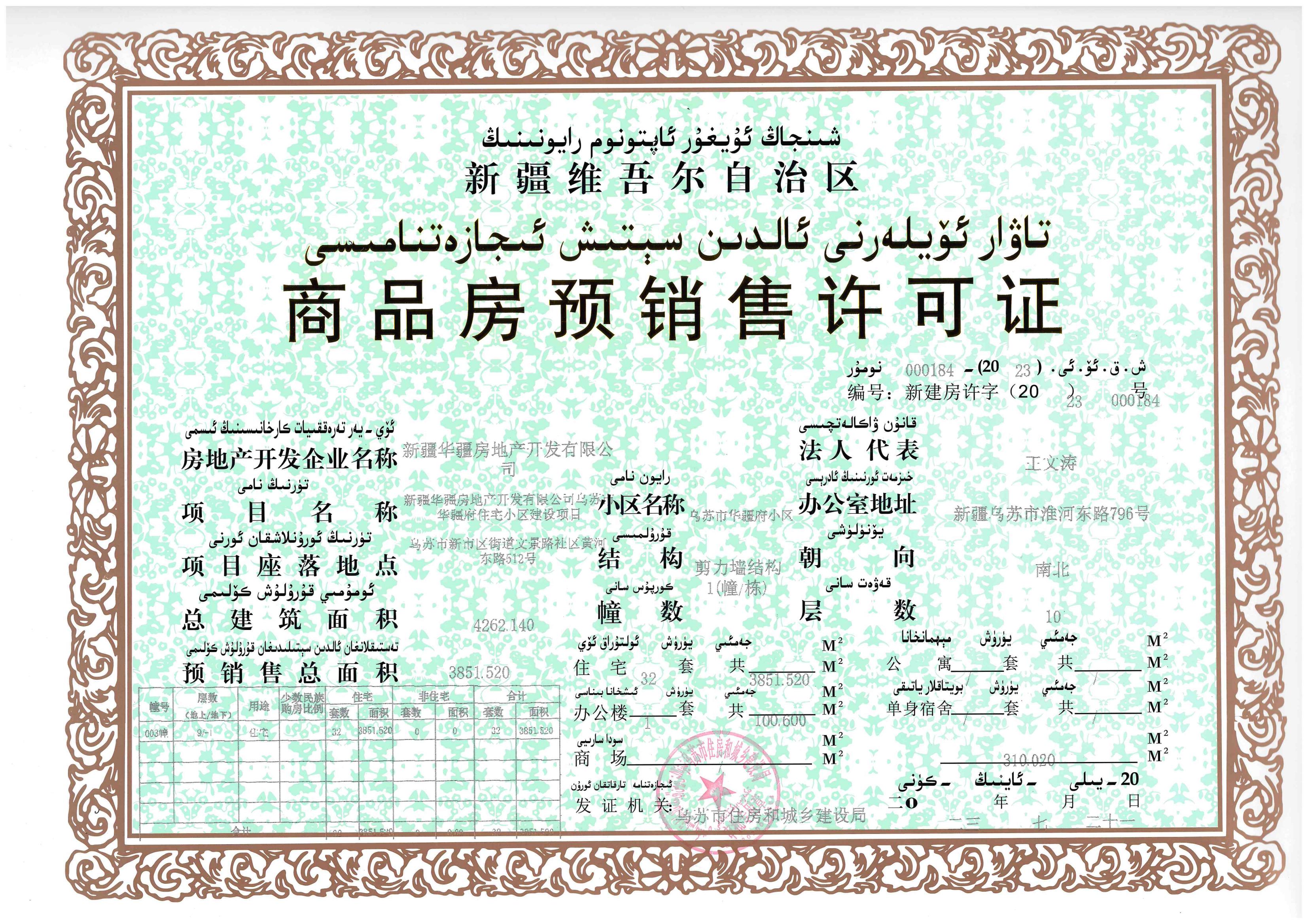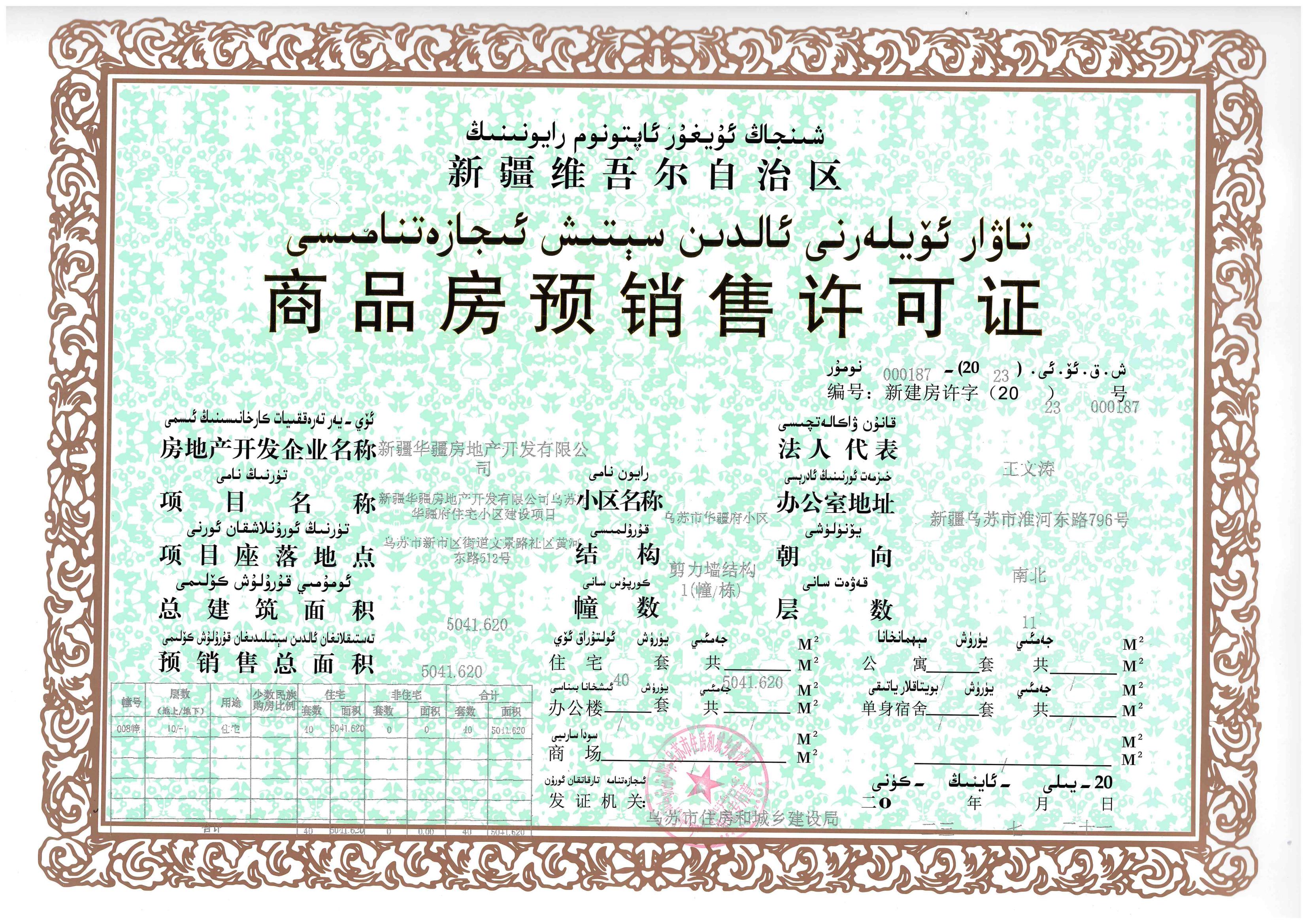 由新疆华疆房地产开发有限公司开发建设的华疆府小区项目1号、3号、4号、5号、7号、8号、9号楼共计7栋268套商品房(其中:住宅260套,非住宅8套),预销售总面积34896.56平方米,位于新市区办事处黄河东路512号。经审查该项目符合预售条件,根据《中华人民共和国城市房地产管理法》《城市房地产开发经营管理条例》《城市商品房预售管理办法》相关规定,依法颁发《商品房预售许可证》,准予预售。编号:新建房许字(2023)000300、新建房许字(2023)000184,新建房许字(2023)000185、新建房许字(2023)000186、新建房许字(2023)000301、新建房许字(2023)000187、新建房许字(2023)000303现予以公示。