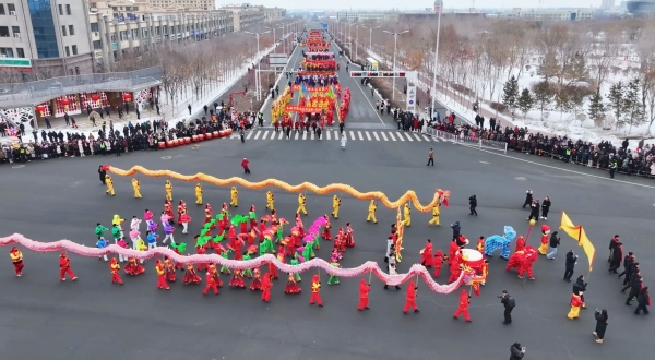 在新城区黄河路展演现场,14支社火方队依次登场,其中有着中国民间社火之乡美誉的甘河子镇舞龙方队尤为吸睛。震天的锣鼓声中,两条巨龙灵动翻飞、盘旋腾跃,数条小龙穿梭于人群之间,身姿矫健、气势磅礴,引得现场观众掌声雷动、欢呼不断。
