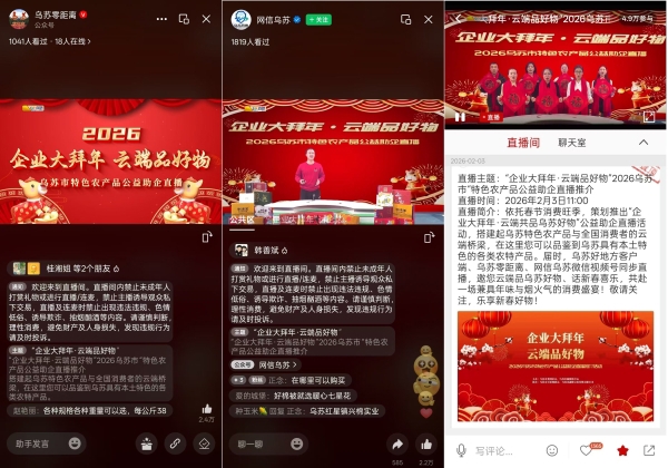 新春临近,年货采办正当时。2月3日,乌苏市举办了“企业大拜年·云端品好物”特色农产品公益助企直播推介活动,依托新媒体技术搭建起乌苏市农特产品与消费者之间的云端桥梁,全景展现乌苏浓厚新春年味,更精准拓宽本地农特产品销售路径,推动“春节流量”高效转化为“消费增量”,实现公益助企、品牌赋能、消费惠民三方共赢。