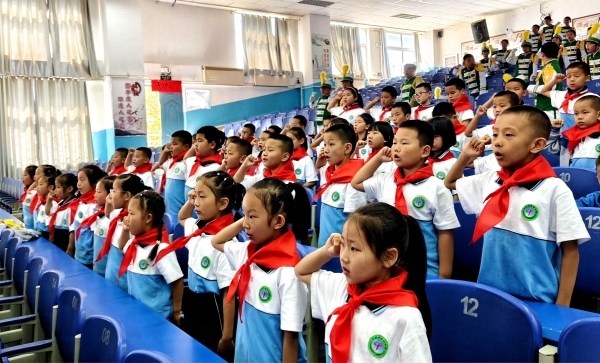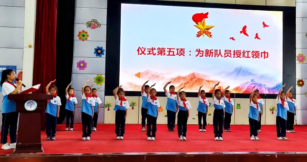 在庄重的入队仪式上,老队员代表为新队员佩戴红领巾,全体少先队员重温入队誓词、齐唱队歌。通过规范入队仪式程序,培养队员们坚定的理想信念,引导队员们在少先队组织下,立志向、修品行、练本领,展现新时代好少年昂扬向上的精神风貌。