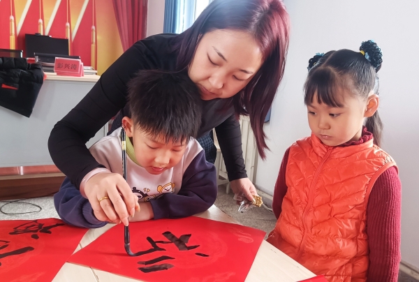 村民引导孩子写“福”字。