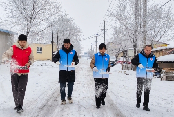 南苑街道黄河路社区党支部联合辖区企业开展融雪除冰专项行动,重点对新城巷巷道内的结冰路段及区域均匀撒布融雪剂,加速冰雪融化,有效防止路面二次结冰。