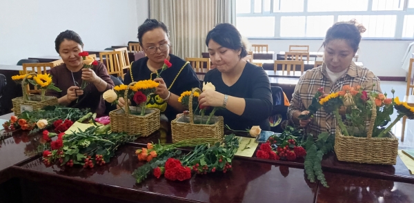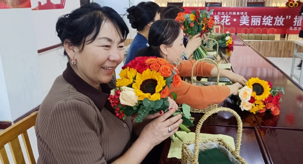 乌苏市南苑街道振兴路社区居民古丽里·阿衣提哈孜说:“我是第一次亲手插花做花篮,学习到新技能,感受到了艺术的魅力和生活的美好,特别棒。”
