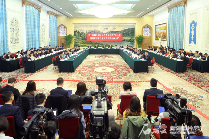 3月7日,参加十四届全国人大二次会议的新疆代表团在人民大会堂新疆厅举行全体会议,并向中外媒体开放。石榴云/新疆日报记者 崔志坚摄