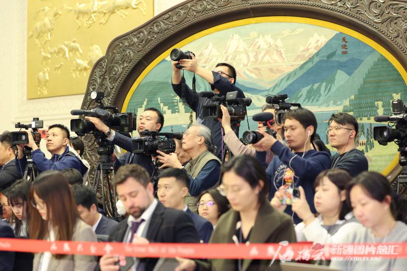 3月7日,参加十四届全国人大二次会议的新疆代表团在人民大会堂新疆厅举行全体会议,并向中外媒体开放。图为中外媒体记者进行现场采访。石榴云/新疆日报记者 崔志坚摄