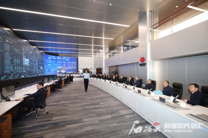 3月12日,自治区党委书记马兴瑞、自治区主席艾尔肯·吐尼亚孜,国家能源集团董事长刘国跃、总经理余兵,在国家能源集团生产运营协同调度指挥中心听取有关工作介绍。石榴云/新疆日报记者 崔志坚摄