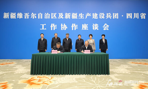 4月7日,新疆维吾尔自治区及新疆生产建设兵团·四川省工作协作座谈会在成都召开。图为四川省委副书记、省长黄强,自治区党委副书记、自治区主席艾尔肯·吐尼亚孜代表两省区签署《新疆维吾尔自治区人民政府 四川省人民政府战略合作框架协议》。石榴云/新疆日报记者 崔志坚摄