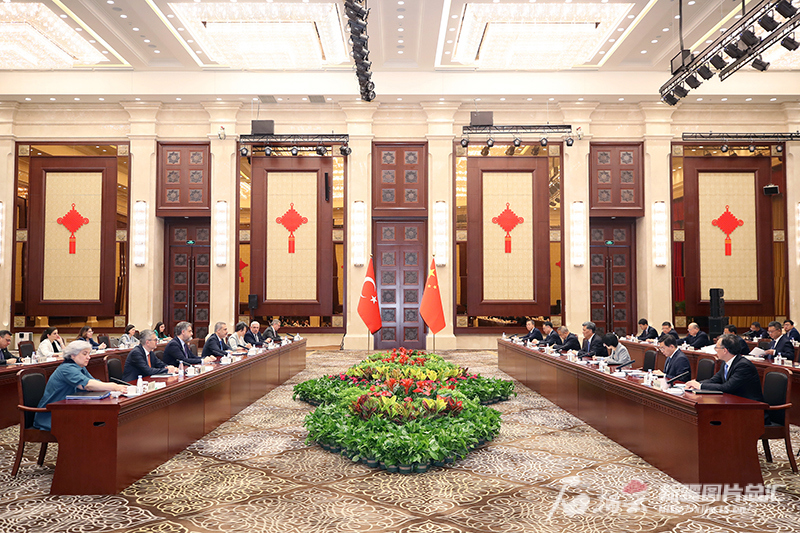 6月5日,自治区党委书记马兴瑞、自治区主席艾尔肯·吐尼亚孜在乌鲁木齐会见土耳其外交部长费丹一行。石榴云/新疆日报记者 崔志坚摄