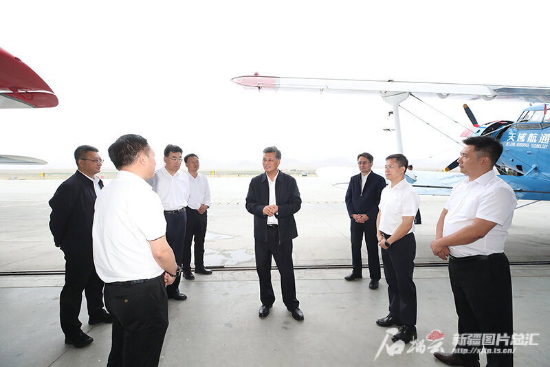 7月2日,自治区党委书记马兴瑞在石河子花园机场,详细了解天域航通大型无人运输机性能、应用领域、市场前景。石榴云/新疆日报记者 崔志坚摄