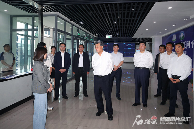 7月2日,自治区党委书记马兴瑞在新疆纺织产业互联网运营平台,听取项目建设和运营情况介绍。石榴云/新疆日报记者 崔志坚摄
