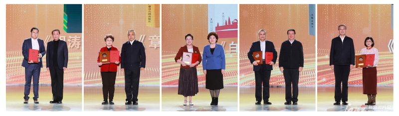 12月20日晚,张宏森为周涛的散文集《周涛散文自选集》、艾尔肯·吐尼亚孜为章德益的诗歌集《章德益诗选》、祖木热提·吾布力为叶尔克西·胡尔曼别克的长篇小说《白水台》、努尔兰·阿不都满金为阿拉提·阿斯木的长篇小说《他人的篝火》、何忠友为阿舍的长篇小说《阿娜河畔》颁授天山文学奖(拼版图片)。石榴云/新疆日报记者 崔志坚摄