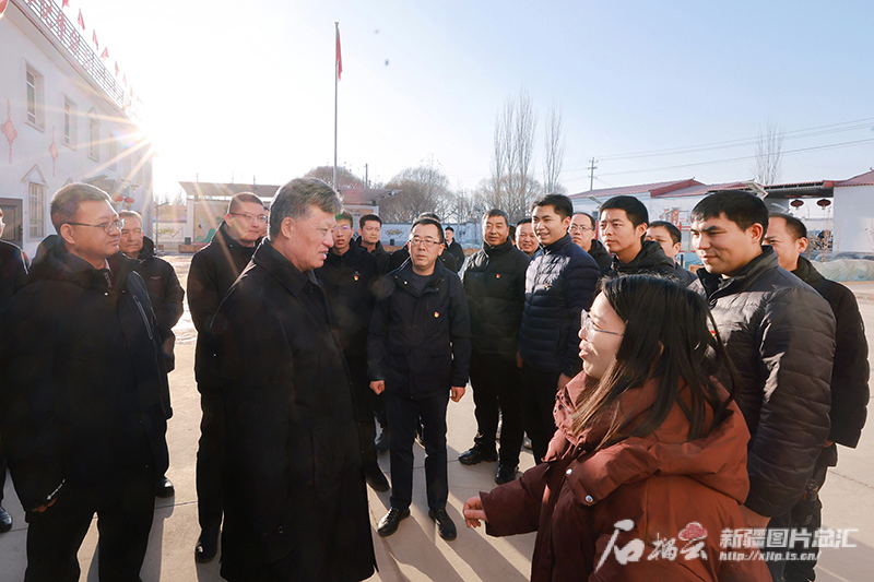 1月11日,自治区党委书记马兴瑞在喀什地区英吉沙县色提力乡帕其英也尔村,同自治区党委办公厅驻村工作队干部亲切交流。石榴云/新疆日报记者 崔志坚摄