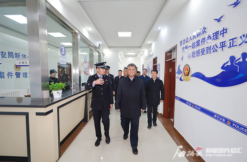 2月25日,自治区党委书记马兴瑞在伊宁市新华东路派出所,了解运行管理和警力优化配置成效。石榴云/新疆日报记者 崔志坚摄