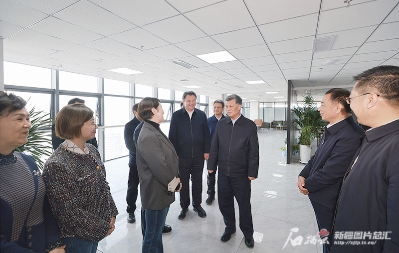2月25日,自治区党委书记马兴瑞在霍尔果斯市营利性服务业总部经济大楼,向相关负责人询问企业落地、产业发展进展情况。石榴云/新疆日报记者 崔志坚摄