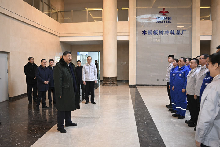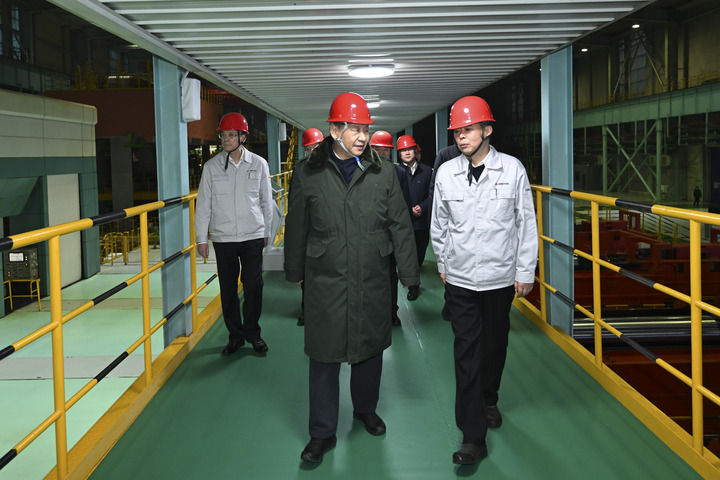1月22日至24日,中共中央总书记、国家主席、中央军委主席习近平冒着严寒来到辽宁,看望慰问基层干部群众。这是23日下午,习近平在本溪市考察本钢板材冷轧总厂第三冷轧厂车间。新华社记者 翟健岚 摄