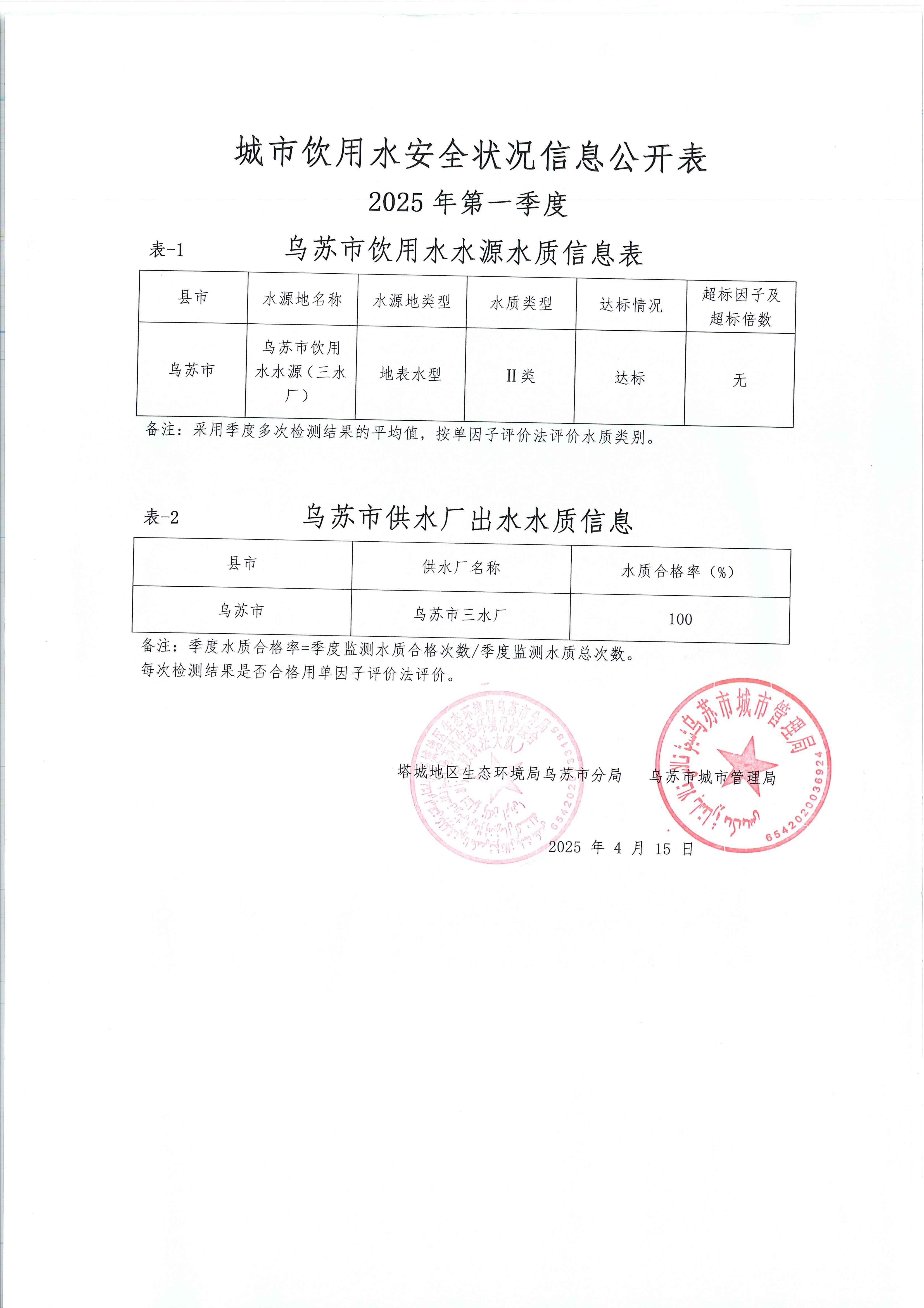 关于乌苏市第一季度城市饮用水安全状况信息的公告