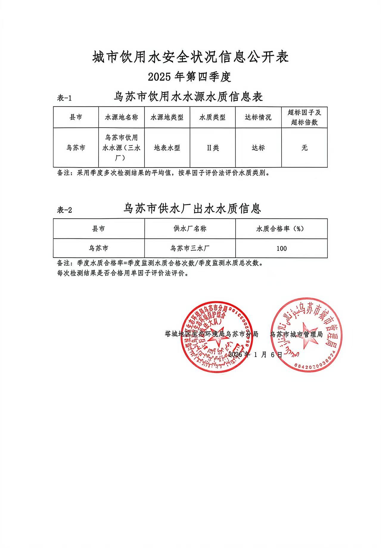 关于乌苏市第四季度城市饮用水安全状况信息的公告