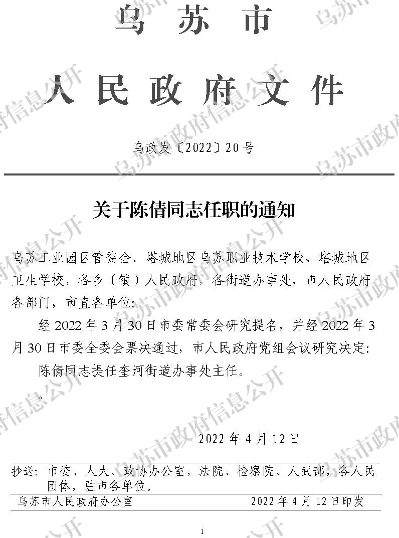 索引号: 11654202010313502B-2022-00272 发布机构: 乌苏市人民政府办公室 发布日期: 2022-04-12 所属主题: 人事信息 索引号: 11654202010313502B-2022-00272 发布机构: 乌苏市人民政府办公室 发布日期: 2022-04-12 所属主题: >人事信息 关于陈倩同志任职的通知 发布时间:2022-04-12 00:00:00 【字体:小 大】