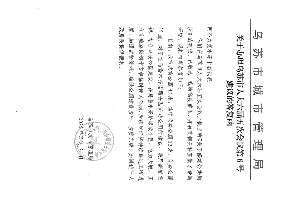 索引号: 6542020010/2025-00264 发布机构: 乌苏市人民政府办公室 发布日期: 2025-05-28 所属主题: 议案提案 索引号: 6542020010/2025-00264 发布机构: 乌苏市人民政府办公室 发布日期: 2025-05-21 所属主题: >议案提案 关于乌苏市第六届人民代表大会第五次会议第6号建议答复函 发布时间:2025-05-28 18:11:09 【字体:小 大】 相关内容