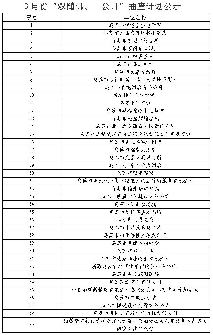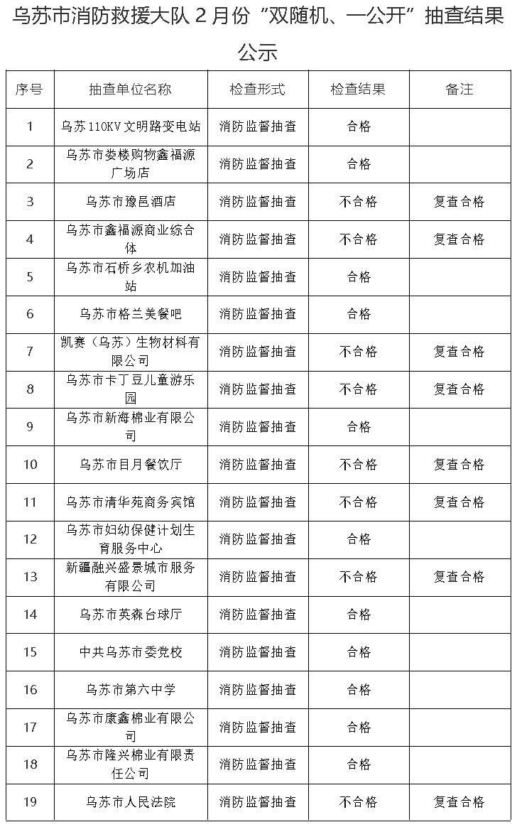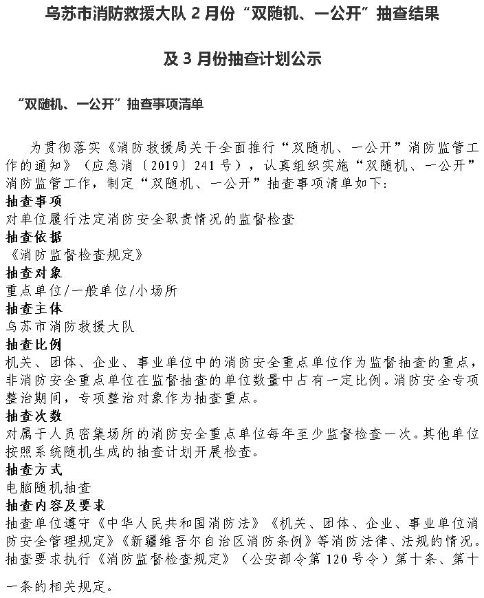乌苏市消防救援大队2月份“双随机、一公开”抽查结果 及3月份抽查计划公示