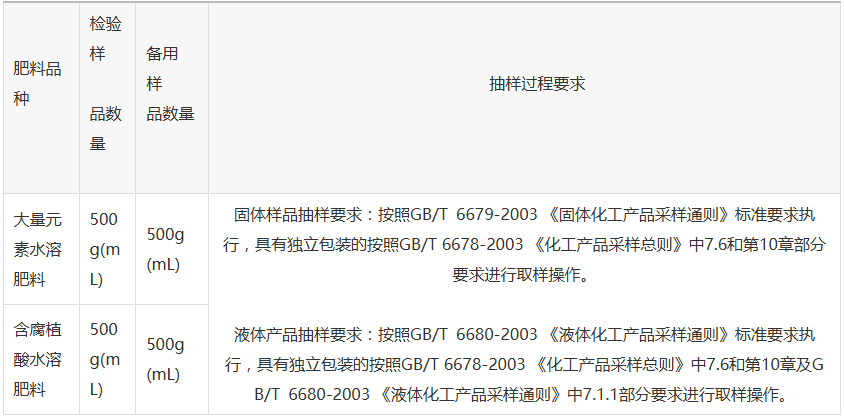 本次抽查的产品范围:大量元素水溶肥料、含腐植酸水溶肥料,抽取的样品型号规格或等级划分要求如下: