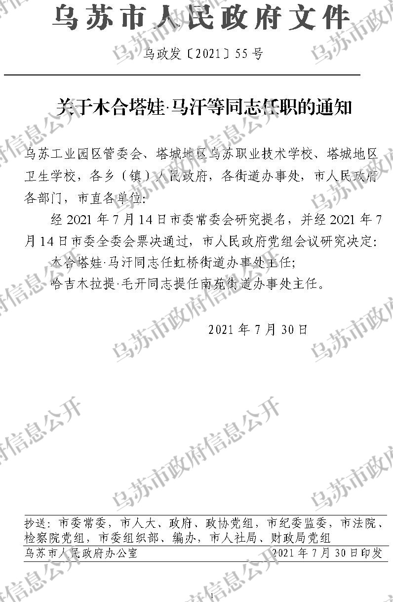 索引号: 11654202010313502B-2021-00394 发布机构: 乌苏市人民政府办公室 生效日期: 2021-07-30 有效性: 现行有效 文 号: 乌政发〔2021〕55号 所属主题: 市政府文件 索引号: 11654202010313502B-2021-00394 发布机构: 乌苏市人民政府办公室 生效日期: 2021-07-30 有效性: 现行有效 文 号: 乌政发〔2021〕55号 所属主题: 市政府文件 关于木合塔娃·马汗等同志任职的通知 发布时间:2021-07-30 00:00:00 【字体:小 大】