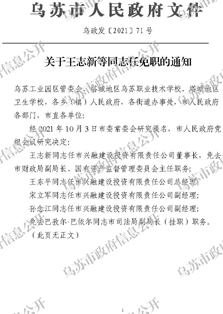 索引号: 11654202010313502B-2021-00667 发布机构: 乌苏市人民政府办公室 生效日期: 2021-10-14 有效性: 现行有效 文 号: 乌政发〔2021〕71号 所属主题: 市政府文件 索引号: 11654202010313502B-2021-00667 发布机构: 乌苏市人民政府办公室 生效日期: 2021-10-14 有效性: 现行有效 文 号: 乌政发〔2021〕71号 所属主题: 市政府文件 关于王志新等同志任免职的通知 发布时间:2021-10-14 00:00:00 【字体:小 大】