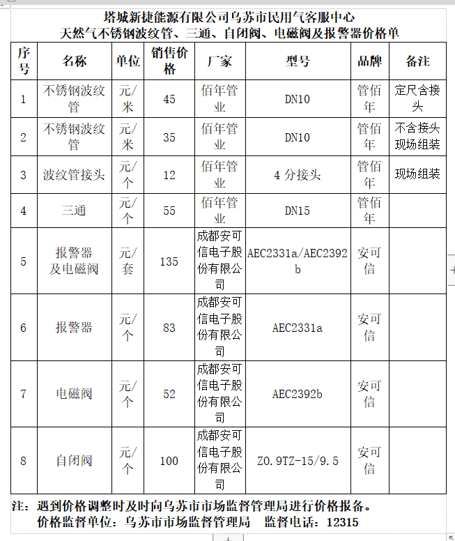 附件:塔城新捷乌苏民用气客服中心天然气不锈钢波纹管、三通、自闭阀、电磁阀及报警器价格单