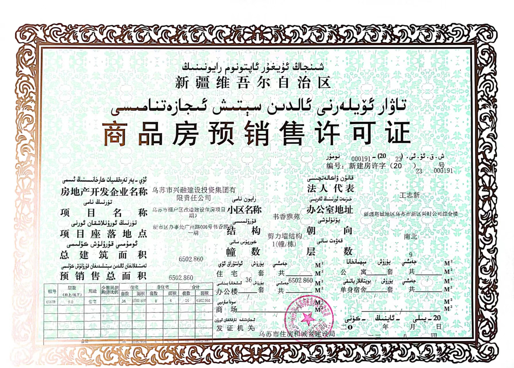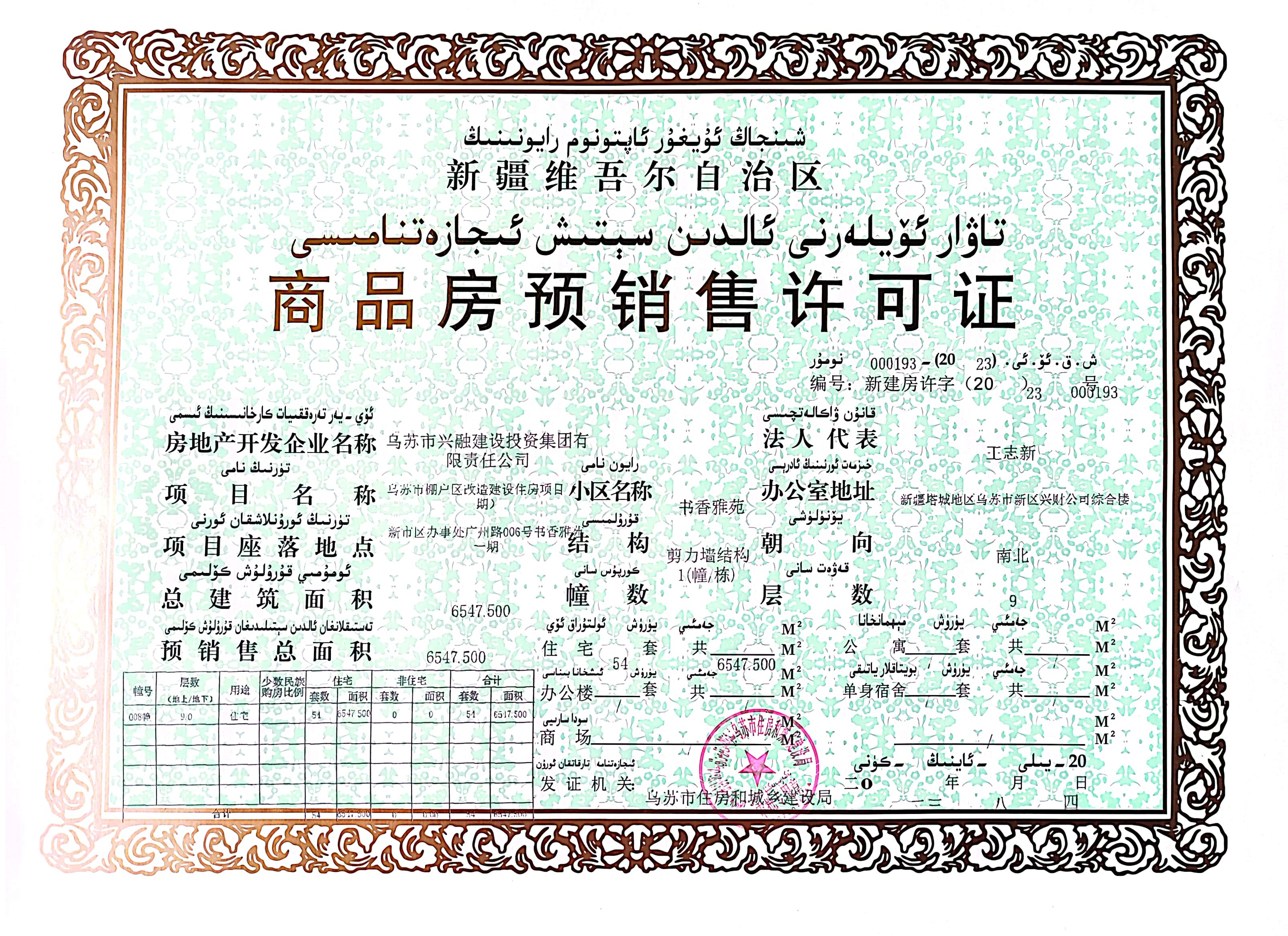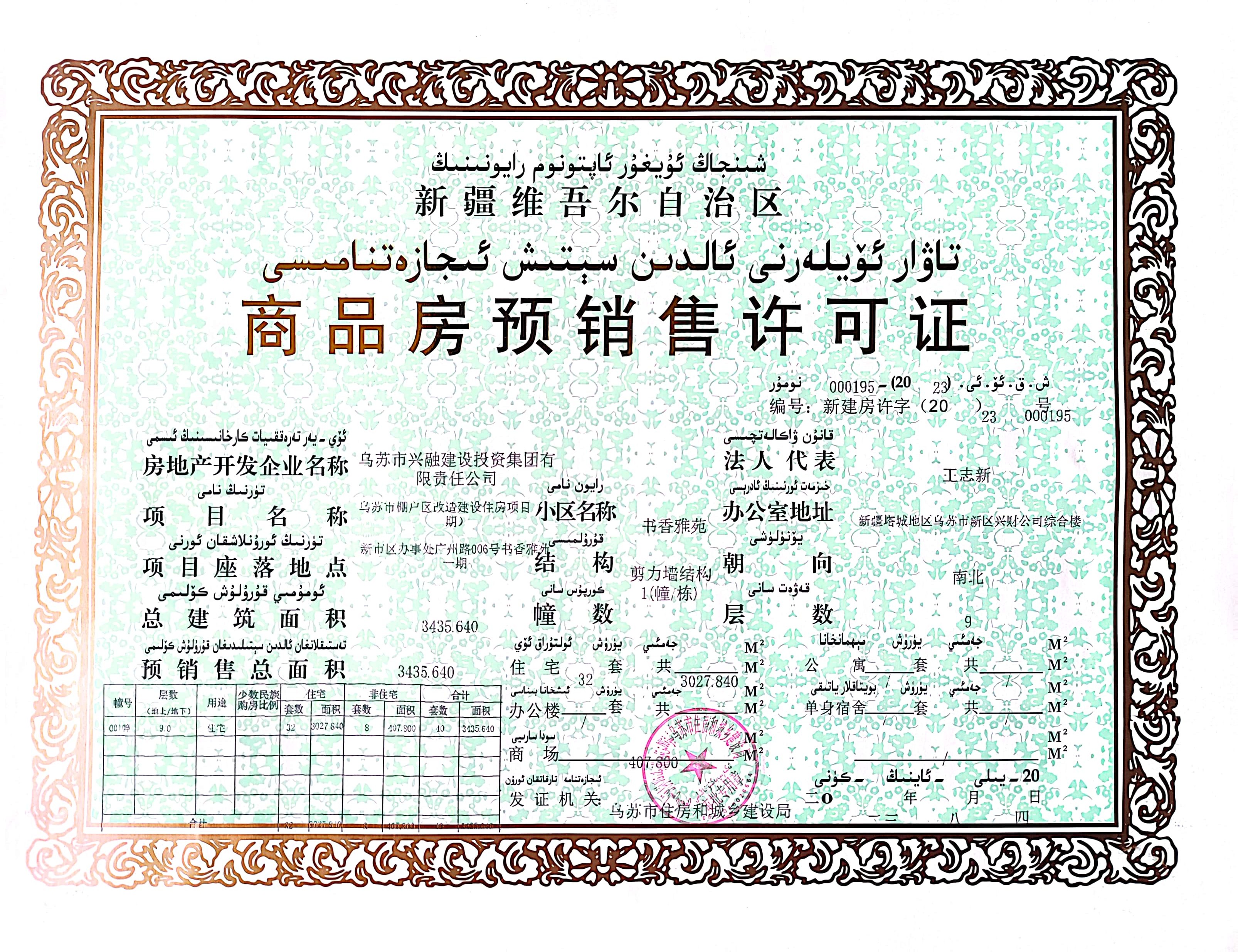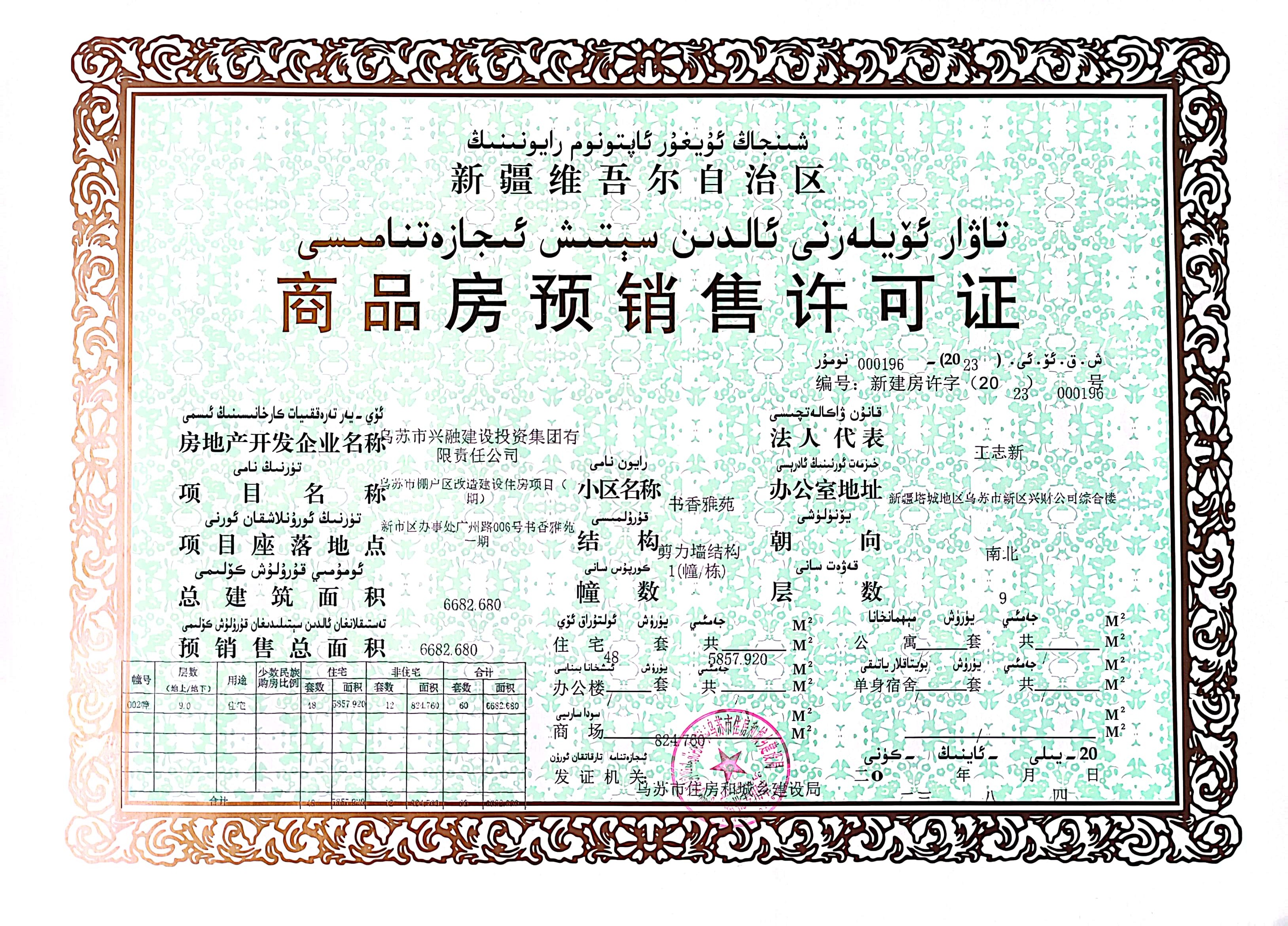 由乌苏市兴融建设投资集团有限责任公司开发建设的书香雅苑一期项目1--9号楼共计9栋370套商品房(其中:住宅350套,非住宅20套),预销售总面积46953.34平方米,位于新市区办事处广州路006号。经审查该项目符合预售条件,根据《中华人民共和国城市房地产管理法》《城市房地产开发经营管理条例》《城市商品房预售管理办法》相关规定,依法颁发《商品房预售许可证》,准予预售。编号:新建房许字(2023)000195、新建房许字(2023)000196,新建房许字(2023)000188、新建房许字(2023)000189、新建房许字(2023)000190、新建房许字(2023)000191、新建房许字(2023)000192、新建房许字(2023)000193、新建房许字(2023)000194现予以公示。