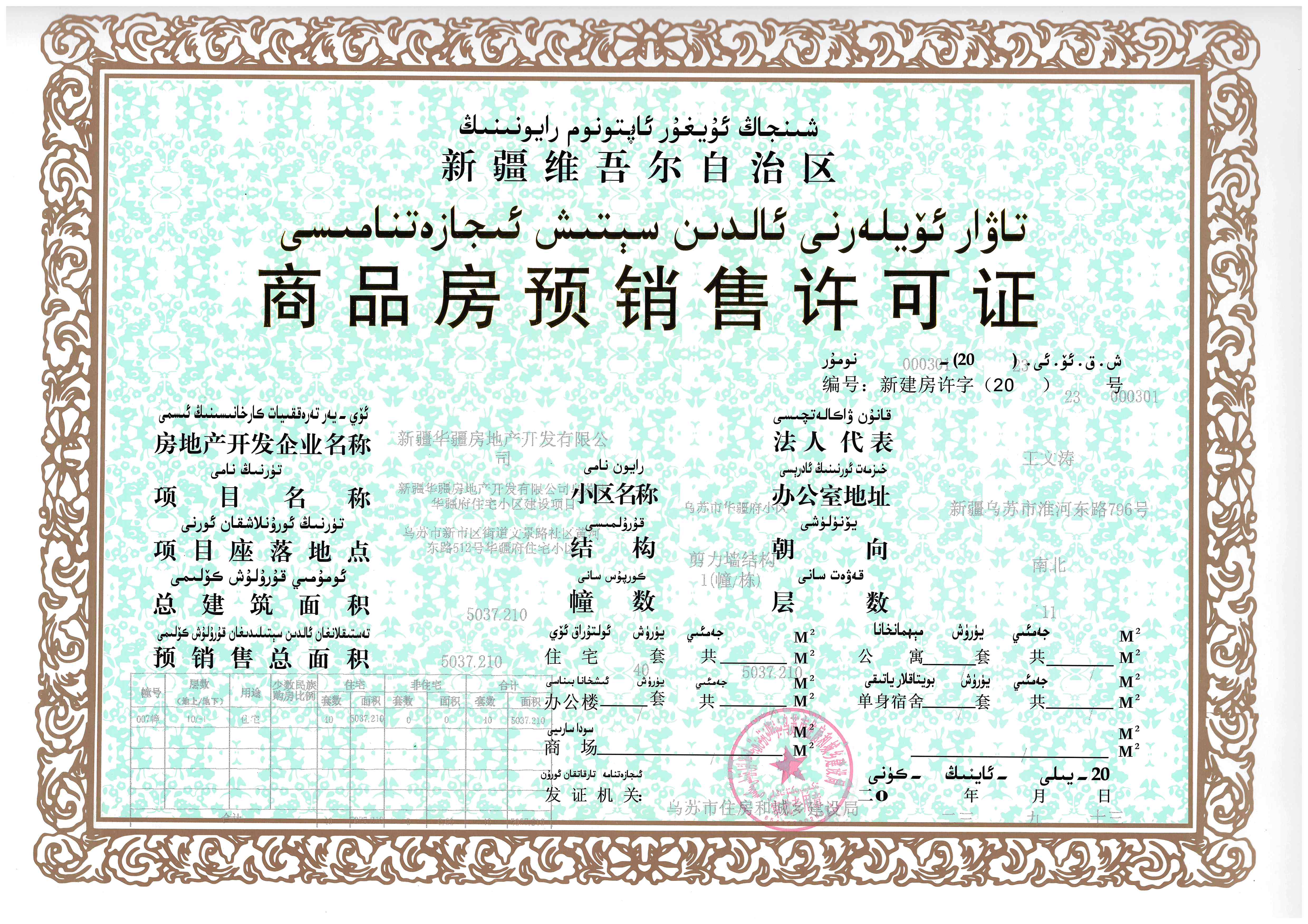 由新疆华疆房地产开发有限公司开发建设的华疆府小区项目1号、3号、4号、5号、7号、8号、9号楼共计7栋268套商品房(其中:住宅260套,非住宅8套),预销售总面积34896.56平方米,位于新市区办事处黄河东路512号。经审查该项目符合预售条件,根据《中华人民共和国城市房地产管理法》《城市房地产开发经营管理条例》《城市商品房预售管理办法》相关规定,依法颁发《商品房预售许可证》,准予预售。编号:新建房许字(2023)000300、新建房许字(2023)000184,新建房许字(2023)000185、新建房许字(2023)000186、新建房许字(2023)000301、新建房许字(2023)000187、新建房许字(2023)000303现予以公示。