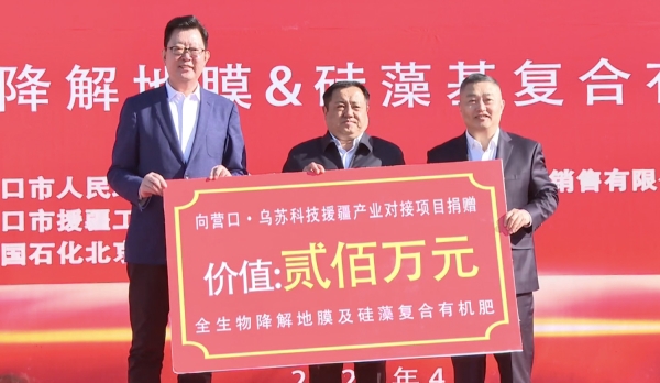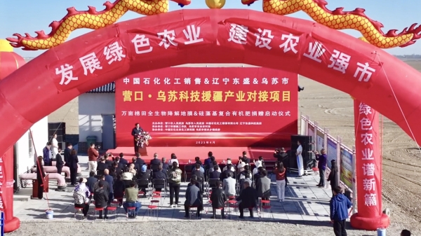 4月11日,营口·乌苏科技援疆产业对接项目——万亩棉田全生物降解地膜、硅藻基复合有机肥捐赠启动仪式在塔城地区乌苏市头台乡杨家庄子村举行,中国石化化工销售有限公司与辽宁东盛科技集团向乌苏市捐赠价值200万元农资产品,助力乌苏农业绿色、可持续发展。