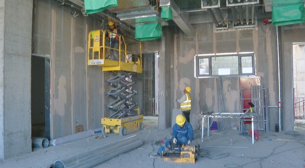 3月12日,在乌苏市文创旅游非遗基地施工现场,室内装修和室外高空吊装作业正紧张有序地进行。