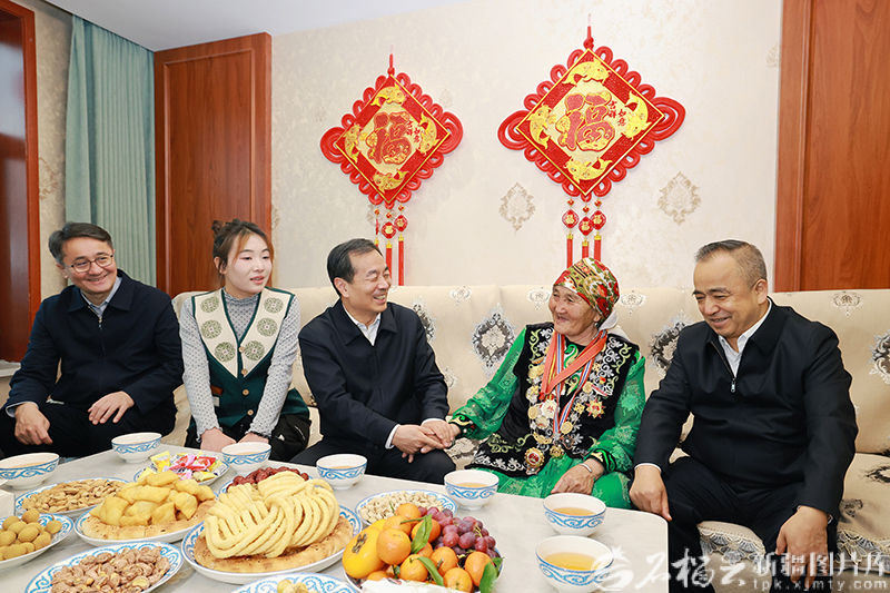 2月14日,自治区党委书记陈小江、自治区主席艾尔肯·吐尼亚孜在阿图什市中心敬老院,为各族老年人送上新春祝福。石榴云/新疆日报记者 崔志坚摄